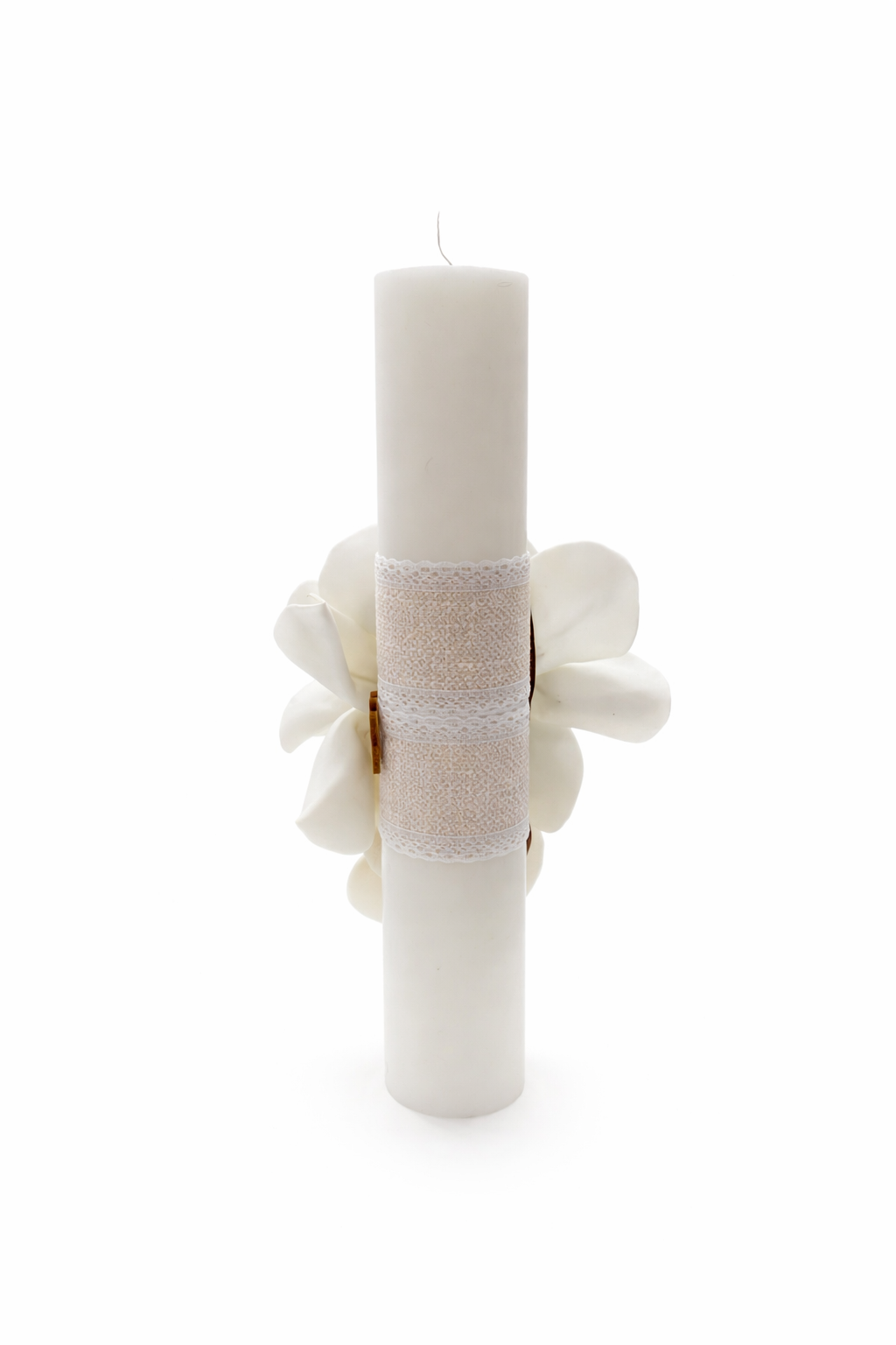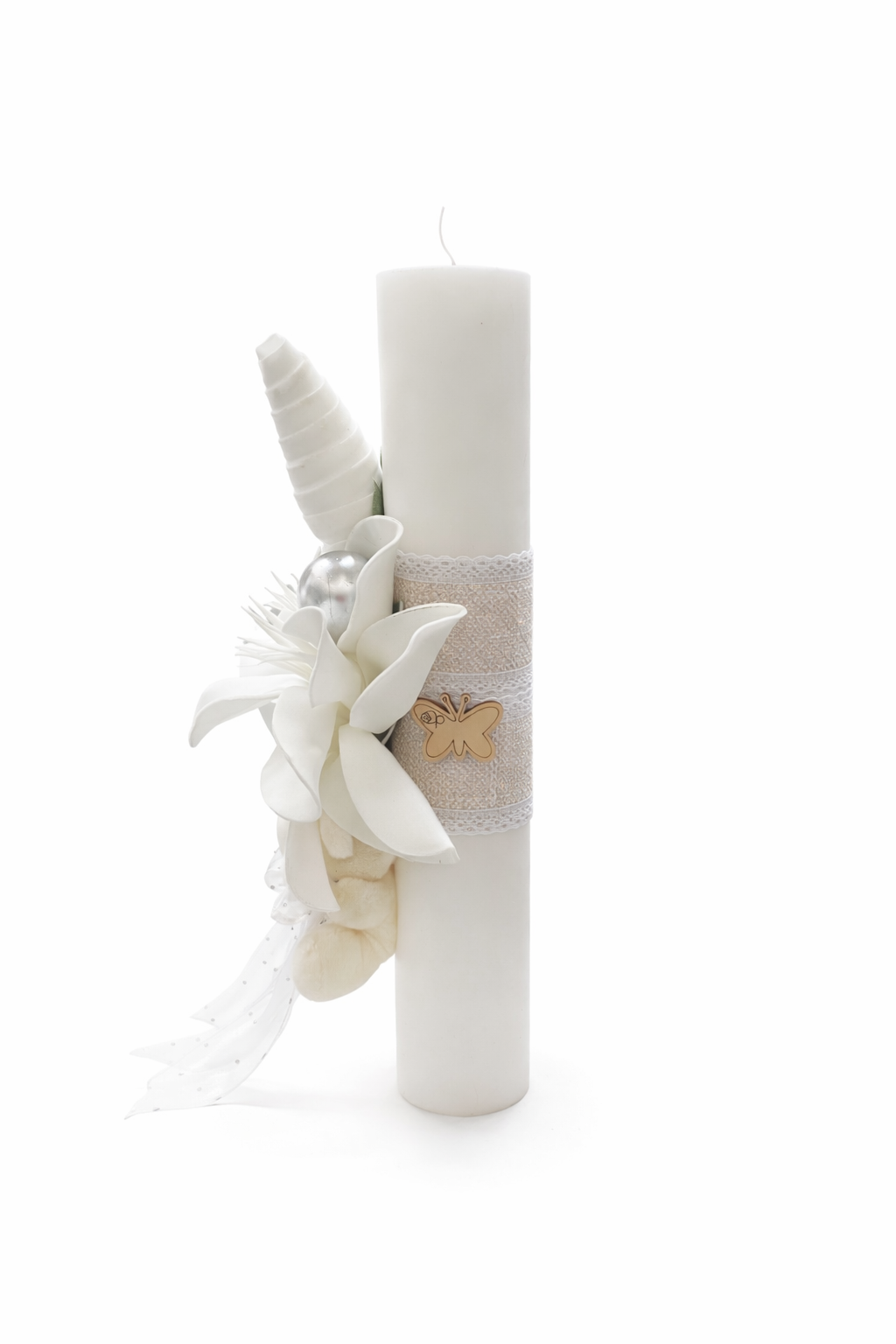 Lumânare decorativă pentru botez, dimensiune 7 × 35 cm, realizată manual și decorată cu magnolie albă elegantă, elemente decorative moderne și perle argintii. Designul este completat de un ursuleț decorativ și o panglică albă delicată, oferind un aspect rafinat, curat și elegant.